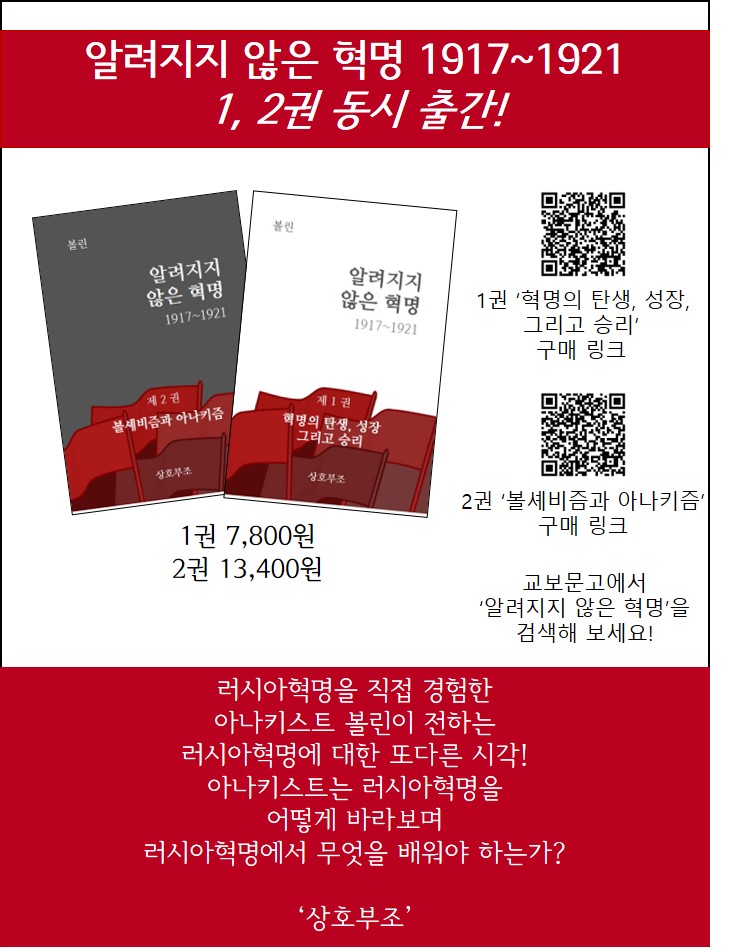 '우리들의 상호부조', 말랑키즘의 출판사 '상호부조'에서 러시아 아나키스트 볼린이 쓴 '알려지지 않은 혁명 1917~1921' 1, 2권을 번역, 출판하였습니다.