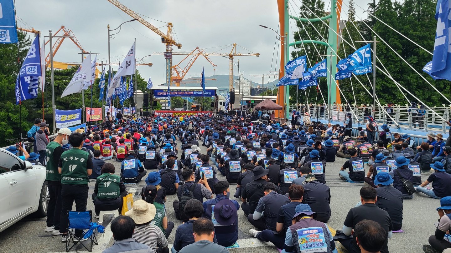 오늘 2022년 6월 25일을 기준으로 대우조선 하청노동자 파업은 23일째 이어지고 있다. 파업 전략의 일부로 하청노동자들은 같은 날로 예정된 1도크 진수를 막기 위해 움직였다. 그 전날인 24일에는 조선소 서문 다리 위에서 금속노조 결의대회가 개최됐다. 이에 연대하기 위해 “비정규직 이제그만 공동투쟁”은 금속노조 결의대회 이후 1박 2일에 걸친 결의대회를 이어갔다. 투쟁에 연대하기 위해 방방곡곡에서 여러 단체가 찾아왔고, 그중에는 낯익은 아시아나케이오지부와 세종호텔지부 동지들도 있었다. 물론 우리 말랑키즘도 6월 20일 “비정규직 이제그만 공동투쟁”이 공표한 입장문을 읽고 하루 앞선 목요일 저녁에 거제로 향해 1박 2일 결의대회에 참여했다.