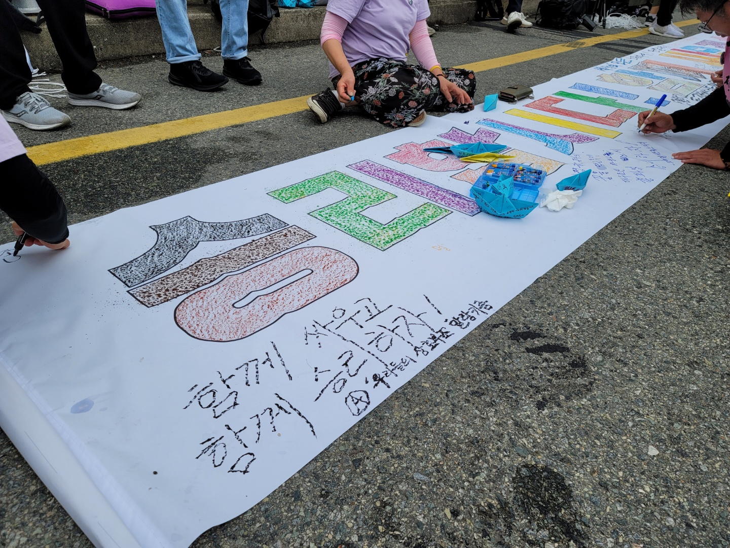 그런 대우조선에서 하청노동자 동지들이 사활을 건 투쟁을 하고 있다니, 아찔한 기분이었다. 믿고 있던 세상이 무너질 때의 고통은 생각보다 더 깊이 와닿았다. 솔직히, 이렇게까지 깊숙이 폐부를 도려내는 느낌이리라고는 생각도 못 했던지라 스스로도 당혹스러웠다. 내가 뭐라고. 내가 뭔데 이렇게까지 아픈가. 하지만 그런 느낌을 받은 것은 비단 혼자만이 아니었다. 영남권의 수많은 금속노조 소속 동지들을 비롯해 서울에서 급히 조직해 한달음에 거제로 내려온 비정규직이제그만공동행동 동지들, 전국 각지에서 달려온 동지들을 보며 모두가 같은 마음이었구나, 이제부터 이 투쟁은 제대로 대우조선, 산업은행이라는 커다란 적과 또 더 큰 싸움을 시작할 수 있겠구나 생각했다.